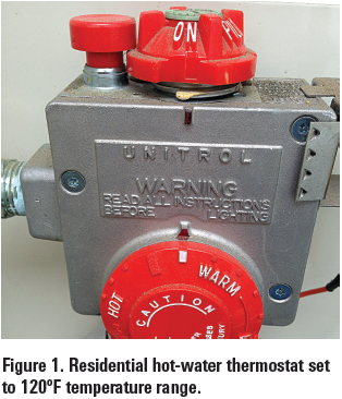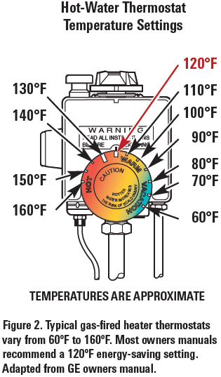 圖2示出了典型的燃?xì)鉄崴骱銣仄,該恒溫器運(yùn)行具有連續(xù)可變設(shè)置的模擬表盤,范圍從VACATION模式到HOT(一些制造商標(biāo)記為頂端非常熱)。在此刻度范圍內(nèi),溫度從低到60-80ºF到高到150-160ºF。坦克制造商,EPA(環(huán)境保護(hù)局)和許多市政府建議將能效和燙傷緩解的目標(biāo)設(shè)置為120ºF。然而,OSHA,美國水暖工程師學(xué)會(ASPE)和軍團(tuán)菌專家建議至少140ºF的水殺死有害細(xì)菌[1-3]。