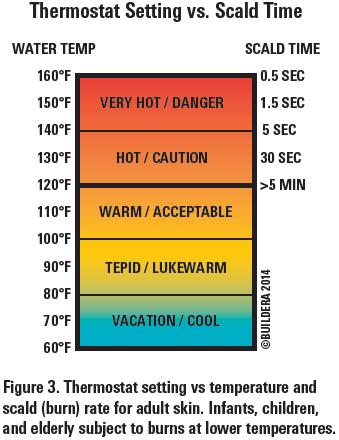 為了減少意外燙傷和保持每月帳單,大多數(shù)節(jié)能的房主將他們的熱水器設(shè)置為推薦的120ºF設(shè)置。圖3示出了健康成人的恒溫器設(shè)置對燙傷時(shí)間。注意,嬰兒,兒童和老年人具有更薄的皮膚或更慢的反應(yīng)時(shí)間,因此更易于不可逆的燒傷,即使在適度升高的溫度下。業(yè)主和維修人員必須特別注意這些乘客的防燙傷。例如,暴露于140°F水的成年人將在僅僅五秒鐘內(nèi)經(jīng)歷不可逆的二度或三度燒傷。顯然,這種熱的水是非常危險(xiǎn)的,可以導(dǎo)致嚴(yán)重傷害最有韌性的成人,更不用說兒童,殘疾人或老人。