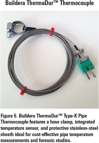 如圖6所示的Buildera ThermaDur TM K型管夾表面熱電偶安裝在距離熱水器頂部大約1“的3/4”銅管熱水出口周圍。在熱電偶安裝期間取下管道絕緣層并重新安裝,以最大限度減少環(huán)境溫度對熱水出口測量的影響。由于銅管的高導(dǎo)熱性和快速響應(yīng)時(shí)間,外部管表面溫度近似于實(shí)際水溫,其中Buildera通過從源獲得的獨(dú)立水溫測量驗(yàn)證。