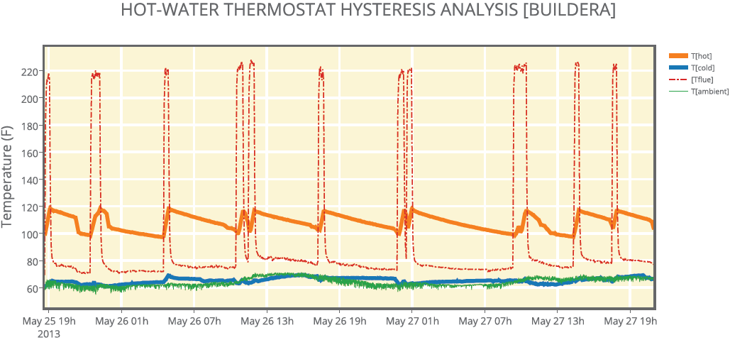 當(dāng)Buildera首先在各種水龍頭上使用浸入式熱電偶(Fluke®80PK-22或類似產(chǎn)品)測試水溫時(shí),熱水溫度在113-119ºF之間測量,在考慮到加熱器和龍頭。為了沖洗管道內(nèi)的溫水,水自由流動直到溫度穩(wěn)定在其最大值附近。這表明,在基線測量時(shí),熱水器能夠產(chǎn)生足夠的熱水以滿足淋浴。然而,這樣的測量不足以理解水溫如何隨著不同的需求負(fù)載在一天中變化,并且更具體地,為什么清晨淋浴溫度遠(yuǎn)遠(yuǎn)低于最低可接受水平。