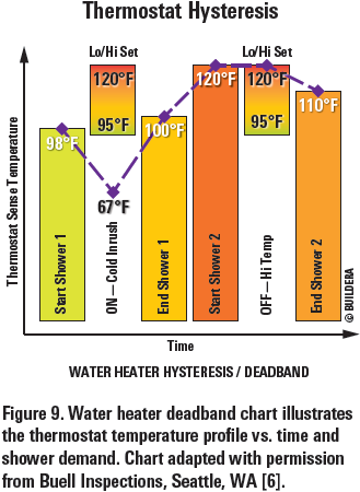 憑借法醫(yī)知識,補(bǔ)救辦法更加明顯。一種解決方案提高恒溫器溫度,使得低跳閘點(diǎn)至少足夠熱以用于舒適的第一噴淋。使用圖8作為建立新閾值的指南,將恒溫器設(shè)置提高10ºF至130ºF會將最低熱水輸出提高至107-113ºF,這是更合適的淋浴溫度。實(shí)際上,在將恒溫器高跳閘點(diǎn)增加到130°F之后,房主經(jīng)歷了舒適的淋浴,即使在第一次使用時(shí)。然而,該解決方案還由于更高的總體溫度和堆疊效應(yīng)而增加了燙傷的風(fēng)險(xiǎn)。