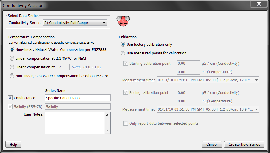 選擇校準(zhǔn)方法。默認(rèn)情況下,數(shù)據(jù)使用出廠校準(zhǔn)進(jìn)行校準(zhǔn)。要輸入自己的校準(zhǔn)值,請(qǐng)選擇“使用測(cè)量點(diǎn)進(jìn)行校準(zhǔn)”,然后從現(xiàn)場(chǎng)儀表的校準(zhǔn)讀數(shù)中輸入溫度和實(shí)際電導(dǎo)率(不是特定電導(dǎo))值。這些現(xiàn)場(chǎng)測(cè)量將用于通過將數(shù)據(jù)調(diào)整為讀數(shù)的百分比來提供校準(zhǔn)的電導(dǎo)率和鹽度數(shù)據(jù)系列。有關(guān)詳細(xì)信息,請(qǐng)參見下面的校準(zhǔn)。