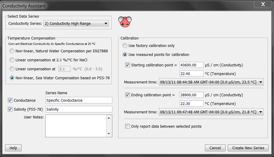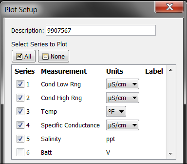 “繪圖設(shè)置”對(duì)話框列出了稱為“特定電導(dǎo)”(或您為系列名稱輸入的名稱)的系列。默認(rèn)單位為微西門子/ cm(μS/ cm)。如果需要,可以將單位更改為毫西門子/ cm(mS / cm)。鹽度的默認(rèn)單位為ppt(千分之一),不能更改。