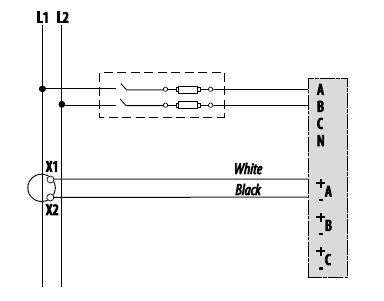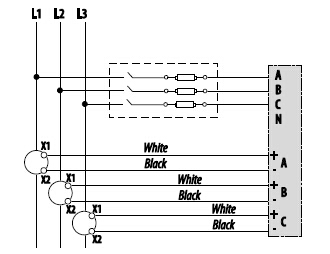 電壓斷開(kāi)開(kāi)關(guān):電壓斷開(kāi)開(kāi)關(guān) 保險(xiǎn)絲:保險(xiǎn)絲(安裝程序負(fù)責(zé)確保遵守當(dāng)?shù)匾?沒(méi)有保險(xiǎn)絲包含在表.) 接地線:接地線 電壓互感器:電流互感器 :電壓互感器 :包含一個(gè)電壓斷開(kāi)保護(hù)用保險(xiǎn)絲或斷路開(kāi)關(guān).保護(hù)裝置必須被評(píng)為在連接可用短路電流點(diǎn).
