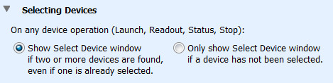 此首選項(xiàng)控制何時(shí)顯示“選擇設(shè)備”窗口。 如果選擇“顯示選擇設(shè)備窗口如果找到兩個(gè)或更多設(shè)備,即使已經(jīng)選擇了一個(gè)”,則當(dāng)多個(gè)設(shè)備連接到計(jì)算機(jī)時(shí),任何時(shí)候顯示選擇設(shè)備窗口。 這允許您在任何時(shí)間從設(shè)備菜單中選擇啟動(dòng),讀取,狀態(tài)或停止時(shí)選擇要使用的設(shè)備。 如果選擇“僅顯示選擇設(shè)備窗口(如果未選擇設(shè)備)”,則選擇設(shè)備窗口將僅在您首次選擇啟動(dòng),讀取,狀態(tài)或停止時(shí)顯示。 該設(shè)備將保持選中狀態(tài),直到您通過工具欄上的選擇設(shè)備圖標(biāo)進(jìn)行更改。