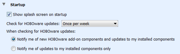 檢查HOBOware更新。此設(shè)置控制頻率,如果一切,HOBOware自動(dòng)檢查Onset網(wǎng)站的任何軟件更新。默認(rèn)設(shè)置為每周一次。