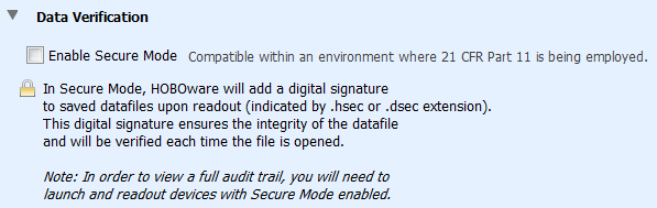 選擇此選項(xiàng)可啟用安全模式,并在讀出記錄器時(shí)(對(duì)于正在使用21 CFR Part 11的環(huán)境),HOBOware Pro會(huì)向新數(shù)據(jù)文件添加數(shù)字簽名。 數(shù)字簽名由hobo文件的.hsec文件擴(kuò)展名和dtf文件的.dsec文件擴(kuò)展名指示。 每次打開數(shù)據(jù)文件時(shí)都會(huì)驗(yàn)證簽名,以確保其完整性。 默認(rèn)情況下禁用此選項(xiàng)。