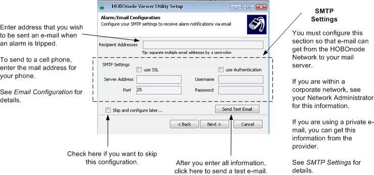 您必須配置SMTP設(shè)置以允許郵件從HOBOnode網(wǎng)絡(luò)獲取到您的電子郵件帳戶。有關(guān)詳情,請參閱SMTP設(shè)置。
