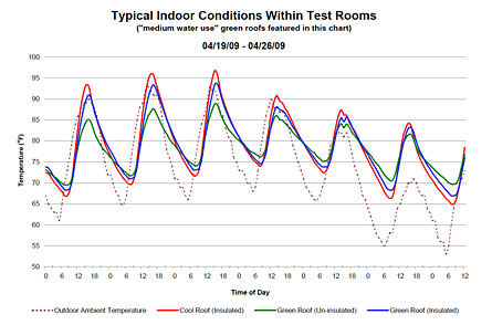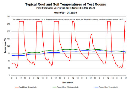 基于以前的屋頂綠化的研究,太陽輻射的27%被反射離開所述植物材料的,60%是由植物材料吸收,并且13%滲入土壤。由于在當前荒山綠化屋頂?shù)难芯课蓓數(shù)捻敳恐脖划a(chǎn)生來自太陽的屏障,少的太陽輻射滲入土壤上的綠色屋頂比在涼爽屋頂。白天,隨著綠色屋頂莢允許更少的熱量,使涼爽屋頂豆莢里的方式。平均來說,非絕緣的屋頂綠化有最酷的白天氣溫和最溫暖的夜間溫度,而隔熱冷屋頂有最熱的白天溫度和最酷的夜間溫度。