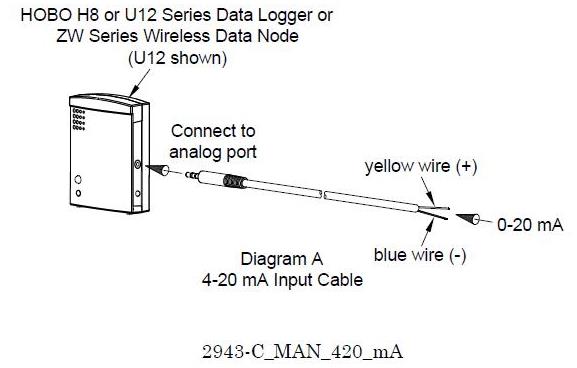 4-20mA輸入電纜,可用于HOBO H8 和 U12 系列數(shù)據(jù)記錄儀和ZW系列數(shù)據(jù)節(jié)點(diǎn)。 4-20輸入電纜 - 該電纜(部件號(hào)CABLE-4-20mA)測(cè)量電流從0到20.1 mA。必須連接4-20mA電纜,使電流流過(guò),并具有正確的極性,如圖A所示。(不要暴露于20mA以上的電流或負(fù)電流)不要切斷灰色電纜的末端